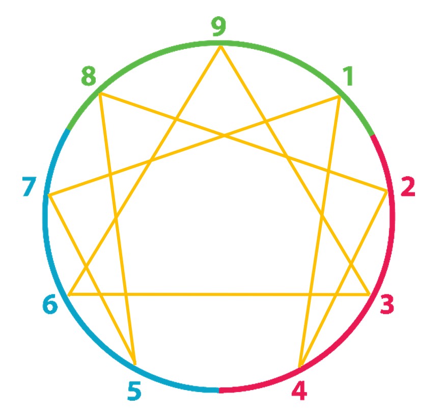 L'Ennéagramme met d'abord en avant nos 3 centres d'énergie : la tête, le coeur et le corps. Naturellement, une des trois portes d’entrée est chez nous dominante. Certains ont un accès plus direct au centre instinctif, d’autres au centre émotionnel, d’autres encore au centre mental. Dans chaque centre nous trouvons 3 bases de personnalité à la fois proches et différentes.